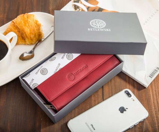 Każdy portfel zapakowany jest tak, by zachwycić naszych klientów. Owijamy go w cienki niczym bibułka papier z logo marki, a następnie wkładamy do sztywnego, tekturowego pudełka w kolorze grafitowym, również ozdobionym logo marki Betlewski®.
