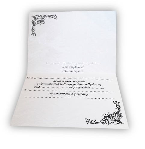 Zaproszenia wykonywane są na papierze błyszczącym, który sprawia, że zaproszenie wygląda bardzo elegancko. Papier zaproszenia występuje w kolorze białym. Zaproszenie składa się na połowę po wysokości.