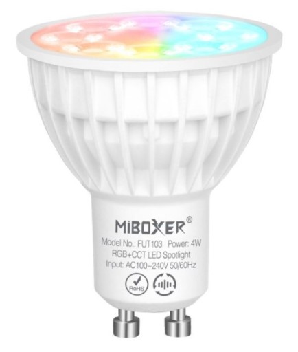 Z możliwością wyświetlenia dowolnego koloru (dostępne 16 mln kolorów z palety RGB), również dowolnego światła białego z przedziału 2700-6500 K, o mocy 4W z uchwytem GU10, sterowalna falami radiowymi 2,4 GHz.