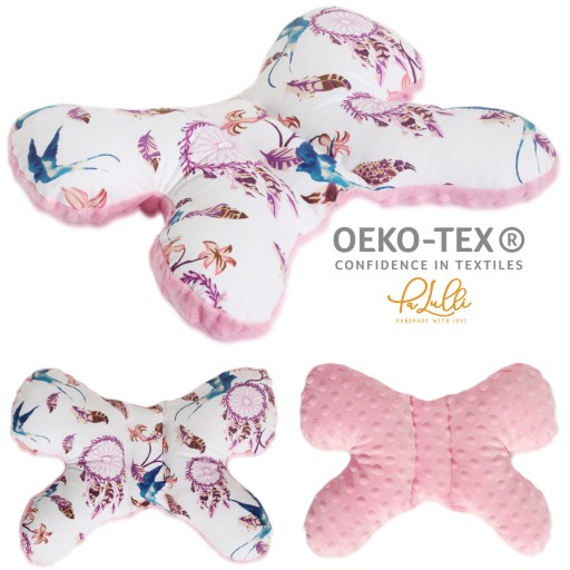 Poduszta antywstrząsowa poprzez kształt "motyla" i miekkie brzegi dopasowuje się do główki dziecka, chroniąc je przed niekontrolowanymi ruchami na boki. Zarówno w wózku czy foteliku samochowodym, poduszka stabilizuje głowkę na boki, a miekkie wykończenie materiałem MINKY otula malucha i zapewnia komfort.