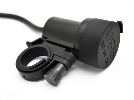 Specjalny uchwyt z mocnego tworzywa, pozwala zamontować gniazdo na kierownicy lub elementach ramy motocykla.