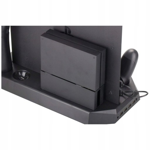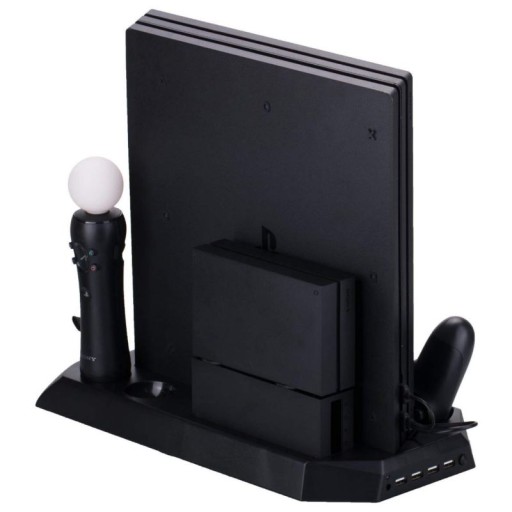 Podstawka umożliwia postawienie konsoli PlayStation 4 PRO i PlayStation VR na bocznej ściance. Pozwala to na zaoszczędzenie miejsca. Podstawka wykonana jest z mocnego plastiku, dzięki czemu może służyć latami. Stojak wyposażony w 2 wentylatory zapewniające chłodzenie konsoli. Pod stojakiem znajdują się gumki stabilizujące konsolę. Stacja zawiera 2 doki do padów i 2 doki na kontrolery MOVE umożliwiające ich ładowanie. Dodatkowo wyposażona jest w 4 porty USB. Włącznik i wyłącznik wentylatorów w podstawce. Produkt jest fabrycznie nowy.