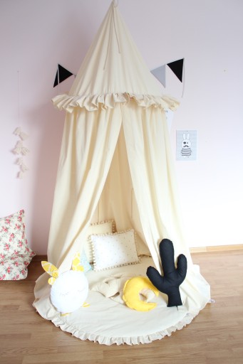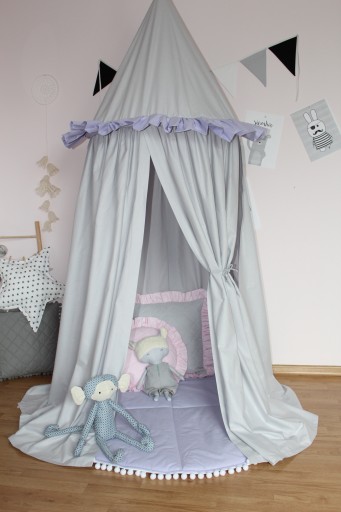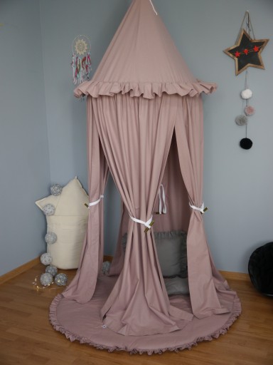 Baldachim to niezwykle efektowna ozdoba pokoju dziecięcego, można zawiesić nad łóżeczkiem niemowlaka, później posłuży jako strefa zabawy i wypoczynku w pokoju przedszkolaka( jako namiot- alternatywa dla Tipi). Znakomicie sprawdzi się w niewielkim pokoiku gdyż nie zajmuję wiele miejsca na podłodze. Wewnątrz szczytu jest pętelka do której można przymocować dowolna zawieszkę, ozdobne lampki. W połowie baldachimu znajdują się ozdobne kijki którymi można podpiąć wejście.Mega Baldachim posiada 4 wejścia (ściany).