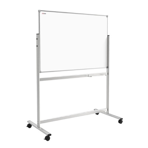Tablica magnetyczna suchościeralna 120x120 cm (dwustronna), na aluminiowym stojaku, który dzięki dołączonym kółkom można bez trudu przemieszczać.