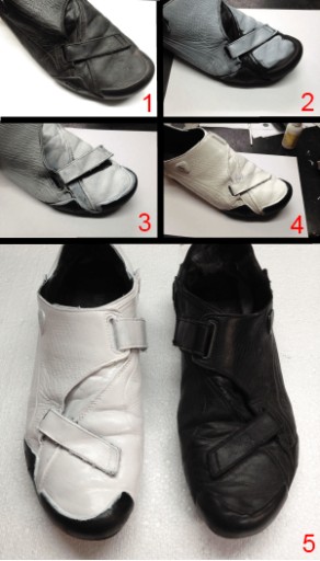 - Kolistymi ruchami rozprowadzić farbę gąbką po obuwiu, nakładając na gąbkę dodatkową ilość farby, jeżeli to konieczne,