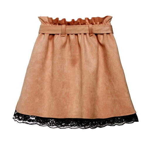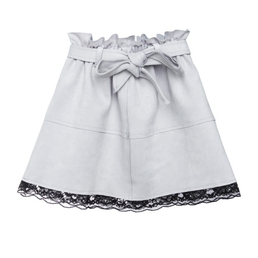 Spódniczka wykonana jest z miękkiej, miłej i naciągającej się tkaniny zamszowej. W pasie znajduje się gumka ,więc będzie pasować na każdą dziewczynkę. Dodatkowo pasek do zawiązania. Dół spódniczki wykończony modną koronką. Ładnie się układa. Modelka na zdjęciu ma 145 cm wzrostu.