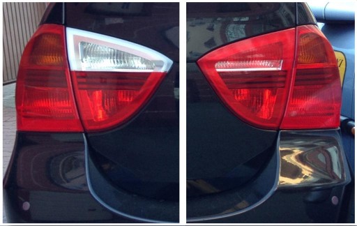 W komplecie folia z wyciętym paskiem na wsteczny, gotowa do naklejenia na obie lampy.