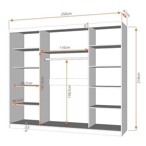 - w szafie zastosowany został bardzo solidny system drzwi przesuwnych (aluminiowe prowadnice + rolki na łożyskach) dzięki któremu drzwi płynnie, lekko i bez żadnego problemu się przesuwają.