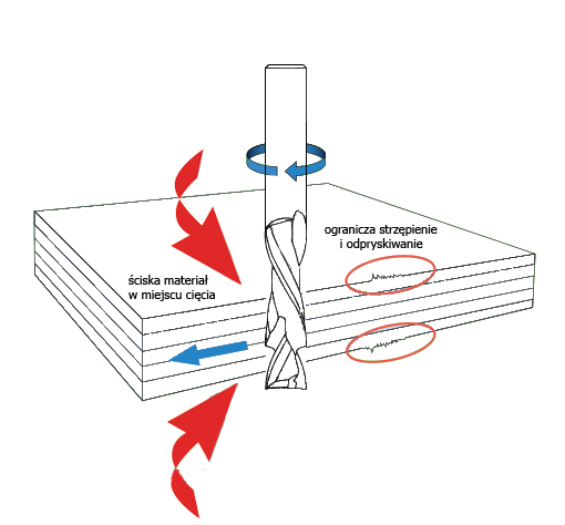 - Frez 2 ostrzowy o geometrii podwójnej - połączonej spirali tzw. COMPRESSION zapewnia bardzo wydajną obróbkę z zachowaniem czystej krawędzi górnej i dolnej materiału