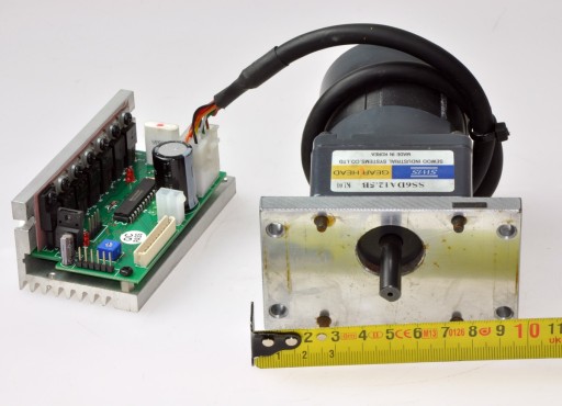 Używany, całkowicie sprawny zestaw napędowy składający się z silnika bezszczotkowego BLDC o symbolu: BG60-N024040, sterownika silnika o symbolu: SBDM-05A oraz przekładni zespolonej z silnikiem, jej symbol: SS6DA12.5B. Cały zestaw wyprodukowany przez koreańską firmę: SEWOO Industrial Systems.