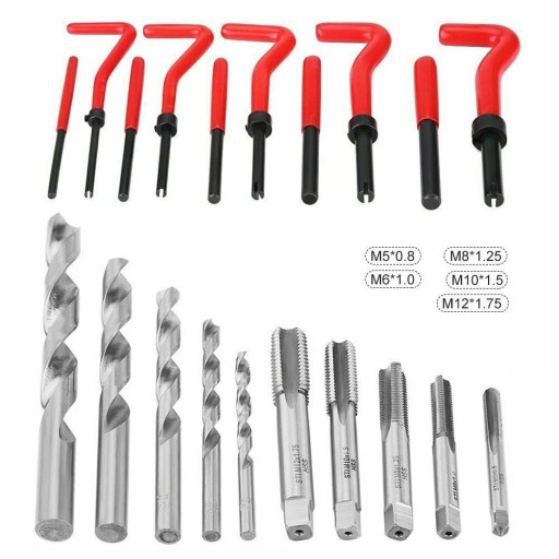 Zestaw przeznaczony jest naprawy uszkodzonych gwintów w silnikach i innych elementach pojazdów. Wiertła i gwintowniki wykonane zostały ze stali szybkotnącej HSS4341.