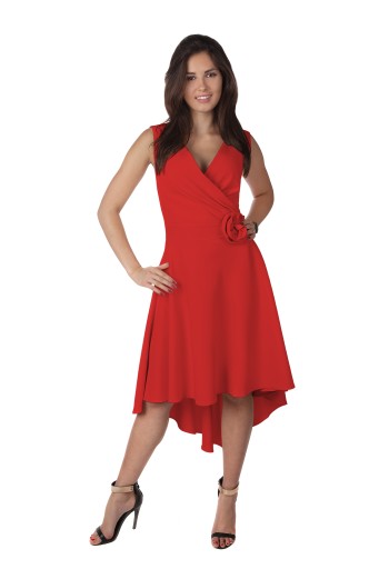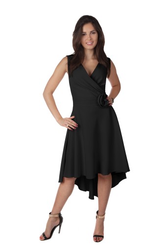 Piękna sukienka ozdobiona kwiatem w formie róży uszyta z lekko elastycznego materiału/barbie/ Fason -dekolt kopertowy z zakładkami odcięta paskiem z ozdobnym kwiatem dół sukienki asymetryczny