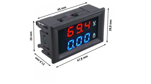 pokazuje aktualne napięcie w woltach a niebieski natężenie