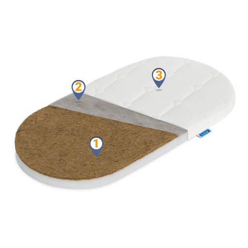 Nasz materac COCO do wózka wykonany jest z odpowiednio dobranej pianki poliuretanowej oraz igłowanej maty kokosowej. Mata kokosowa usztywnia materac pozwalając na swobodny przepływ powietrza w jego wnętrzu, natomiast pikowana dzianina daje dziecku poczucie komfortu w czasie jazdy. Wkład materaca jest dodatkowo obszyty cienką warstwą włókniny.