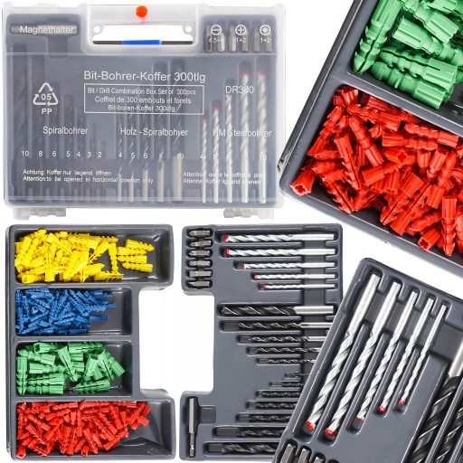 Zestaw wierteł, bitów i kołków rozporowych niezbędny w każdym domu i dla każdego majsterkowicza. Zestaw zawiera 300 elementów w praktycznej plastikowej kasecie.