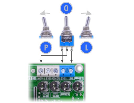 Do regulatora podłączamy dowolny przełącznik trzy-pozycyjny I - 0 - II (SP3T). sposób podłączenia widoczny jest na grafice obok