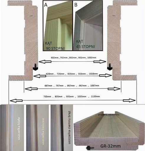 - Futryny wyposażone są w: zawiasy 2 lub 3 , blachę zaczepową, uszczelkę (czarną, brązową, beżową, szarą lub białą). Są to ościeżnice, które pasują do wszystkich rodzajów drzwi wewnętrznych: drewnianych, MDF, również szklanych produkowanych wg Polskiej Normy Budowlanej