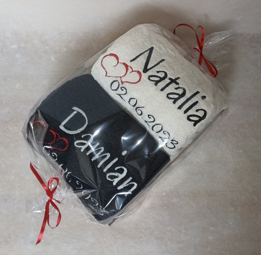W cenie kompletu wykonamy na każdym ręczniku haft, składający się z imienia - np. Natalia, krótkiego tekstu np. 02.06.2023 oraz wybranej grafiki.