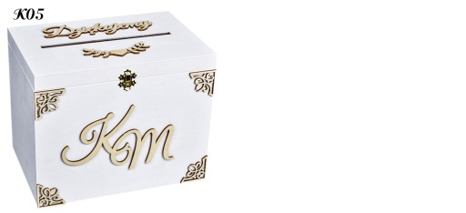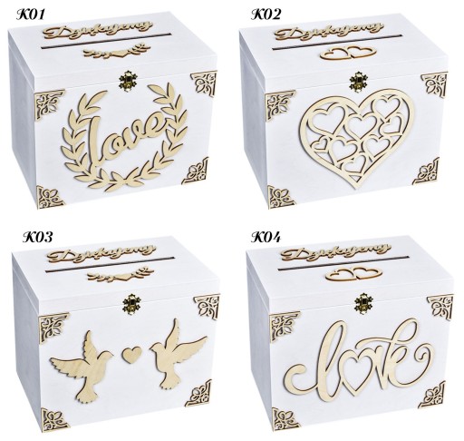 Góra pudełka zawiera ozdobny napis "Dziękujemy", otwór na koperty oraz jeden z poniższych, wybranych przez Państwa dekorów.