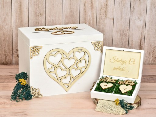 Prezentujemy śliczny zestaw ślubny w kolorze białym, który składa się z pudełka na koperty oraz pudełka na obrączki.