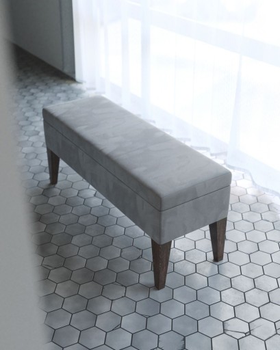 Siedzisko ławki tapicerowane jest wysokogatunkową , łatwo czyszczącą tkaniną Focus firmy Fargotex, nóżki ławki ( dostępne w 4 kolorach) wykonane są z bukowego drewna.