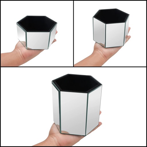 3 GOTKI DO PRZECHOWYWANIA: W zestawie znajdują się 3 srebrne sześciokątne słoiki do przechowywania. Słoiki te różnią się wysokością od małych, średnich i dużych. Uchwyty wykonane są z wytrzymałego szkła lustrzanego. Wewnątrz każdego słoika znajduje się miękka filcowa wyściółka. Najmniejszy pojemnik ma średnicę 12,5 cm (4,92 cala) i wysokość 6,2 cm (2,44 cala). Średnia średnica pojemnika to 12,5 cm (4,92 cala) i wysokość 9 cm (3,54 cala). Wreszcie średnica dużej doniczki wynosi 12,5 cm (4,92 cala) i wysokość 12 cm (4,72 cala). ELEGANCKI DESIGN: Uchwyty są nie tylko uniwersalne i praktyczne, ale także eleganckie i dekoracyjne. Projekt może pasować do wystroju każdej sypialni, łazienki czy salonu. Wszystkie słoiki mają kształt sześciokąta z gładką, lustrzaną powierzchnią, którą można łatwo wytrzeć. 3 pojemniki są odłączane i można je ustawić w linii, w trójkąt lub przechowywać pojedynczo w domu. Te nowoczesne, wielofunkcyjne doniczki są idealnym prezentem urodzinowym lub świątecznym dla przyjaciół i krewnych. CZYSTE STOŁY: Utrzymuj wszystkie blaty w czystości, porządku i porządku. Wewnątrz każdego garnka znajduje się aksamitna wyściółka, aby zawartość była bezpieczna i chroniona przed uszkodzeniem. U podstawy znajdują się miękkie podkładki z gąbki, które chronią powierzchnie przed zarysowaniami i zapobiegają przesuwaniu się słoików po biurkach. Uporządkuj swoje przedmioty i szybko znajdź i wybierz to, czego potrzebujesz, dzięki otwartym blatom. Uchwyty pozwalają zaoszczędzić miejsce na szafkach podumywalkowych, biurkach, stolikach nocnych, regałach, półkach, parapetach i półkach. WIELOKROTNE ZASTOSOWANIA: Garnki mogą służyć jako rozwiązanie do przechowywania różnych drobnych przedmiotów. Przechowuj produkty do makijażu i urody, takie jak kosmetyki, pędzle, lakiery do paznokci, cienie do powiek, szminki i akcesoria do włosów. Te stylowe uchwyty mogą być używane jako porządki na biurku w domu i biurze na długopisy, ołówki, nożyczki i artykuły biurowe. Trzymaj akcesoria łazienkowe, takie jak szczoteczki i pasty do zębów, wykałaczki, waciki, podkładki i wymienne. Słoiki nadają się również do ekspozycji sukulentów w pomieszczeniach.