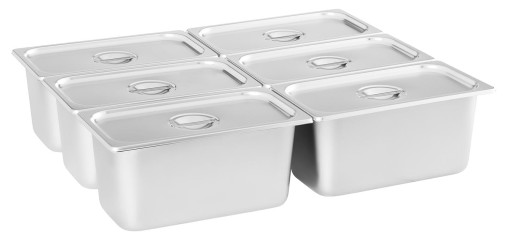 W zestawie znajduje się 6 pojemników GN 1/3 ze stali nierdzewnej wraz z pokrywkami, każdy o pojemności 5,7 l.