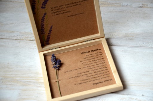 - 2 szt kart zaproszeń wklejanych do wnętrza, dwie gałązki suszonej lawendy
