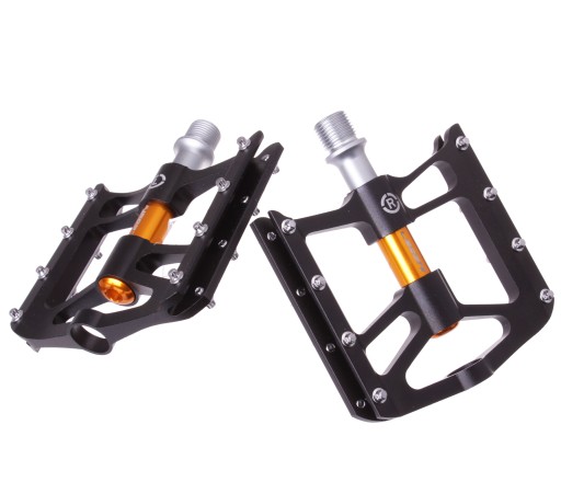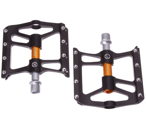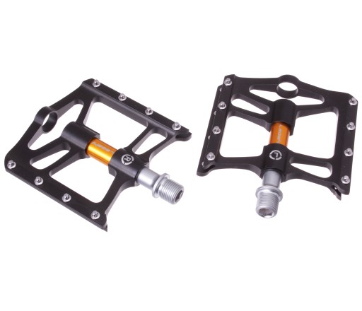 OPIS: Pedały platformowe, korpus aluminiowy CNC, 32 wymienne piny, oś Cr-Mo CNC 9/16, 3 łożyska maszynowe, wielkość platformy 100 mm x 95 mm, waga 317 g/pr.