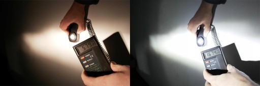Porównując efektywność żarówek H7 LED Mi2 oraz zwykłej żarówki, stosowanej w reflektorach samochodowych użyliśmy tych samych ustawień obiektywu, jednakowego napięcia (14V) oraz tej samej lampy odbłyśnikowej (Fiat Punto II, strona lewa, bez soczewki).