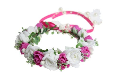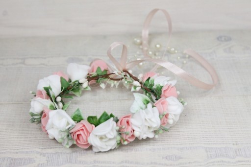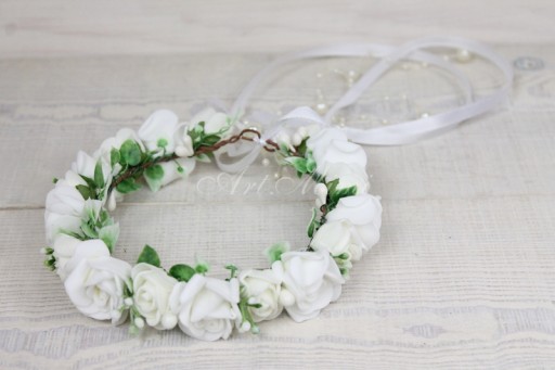 Wyjątkowy i uroczy wianuszek do koka, upleciony z kwiatów różyczek w wybranym kolorze z dodatkiem bluszczu, ozdobnej trawy. Piękną ozdobą jest również sznur perełek i tasiemek satynowych.
