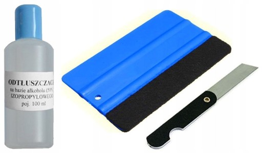 Po pierwsze oprócz folii przydatne będzie nożyk lub nożyczki, źródło ciepła np. suszarka. Niezbędny jest również preparat do odtłuszczenia powierzchni, na której będzie naklejona folia (np. benzyna ekstrakcyjna, denaturat lub inny alkohol) oraz narzędzie do wygładzania naklejonej folii rakiel lub szmatka.