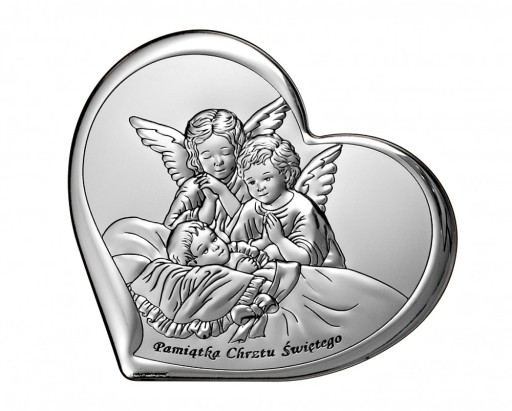 Piękna pamiątka włoskiej firmy BELTRAMI przedstawiająca wizerunek Aniołków czuwających nad dzieciątkiem. Obrazek w kształcie serca z napisem " Pamiątka Chrztu Świętego " osadzony na eleganckim brązowym lakierowanym drewnie. Jest to świetny pomysł na bardzo stylowy i oryginalny prezent. Dodatkowo grawerowana blaszka z dedykacją sprawi, że nabierze on jeszcze większej wartości oraz będzie wspomnieniem na wiele lat. Dzięki wkładanej podpórce obrazek możemy umiejscowić na komodzie lub powiesić na ścianie.