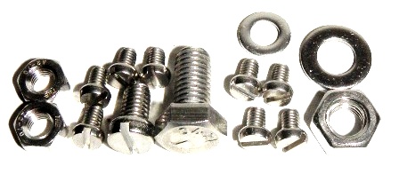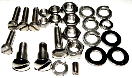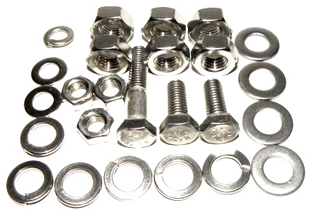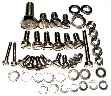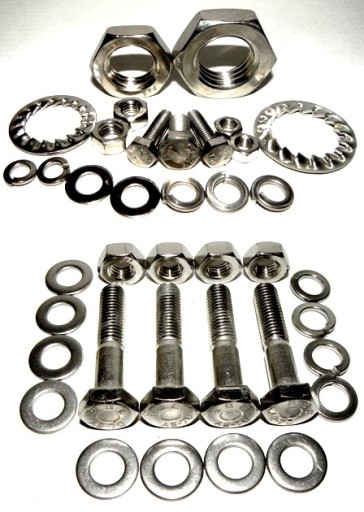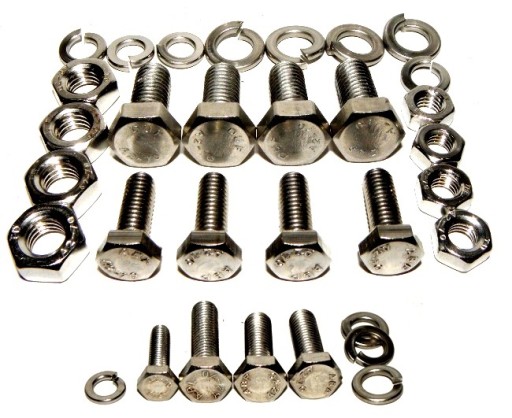 Komplet złożony jest z chromoniklowych elementów nierdzewnych wykonanych w klasie A2. W skład kompletu wchodzą śruby, wkręty, nakrętki i podkładki podzielone w sposób umożliwiający bezproblemowy montaż poszczególnych elementów motocykla.