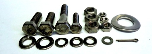 Komplet złożony jest z chromoniklowych elementów nierdzewnych wykonanych w klasie A2 70. W skład kompletu wchodzą śruby, wkręty, nakrętki i podkładki podzielone na 12 osobno spakowanych grup, umożliwiających bezproblemowy montaż poszczególnych elementów motocykla.