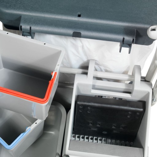 - ORYGINALNY kompletny wózek serwisowy z wyciskarką do mopów płaskich i sznurkowych oraz dwoma dużymi i dwoma mniejszymi wiadrami o pojemności odpowiednio: 17 litrów i 5 litrów, a także uchwytem na worek na odpady 120 litrów - Numatic SM 1405 SRK1
