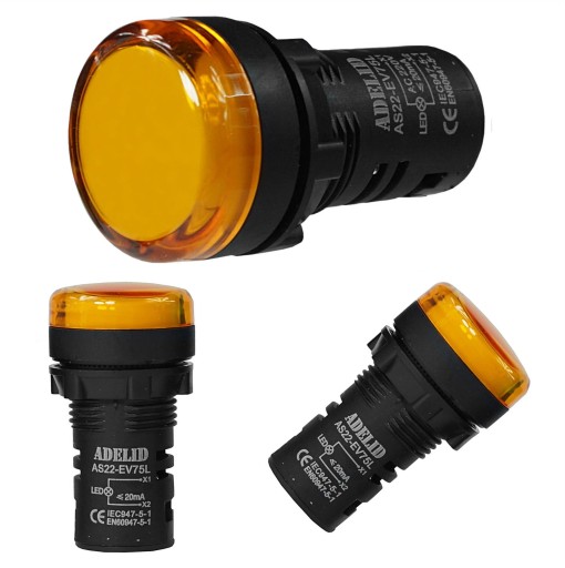 Wysokiej jakości LED'owa lampka kontrolna, sterownicza, marki Adelid, w kolorze żółtym, o napięciu 230V.