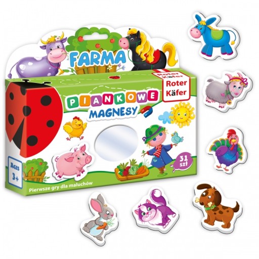 Mój mały świat magnesów Farma to zestaw trójwymiarowych magnesów tematycznych ilustrujących życie na farmie. Układaj magnetyczne puzzle na specjalnej tablicy lub na dowolnej metalowej powierzchni np. na lodówce. Znakomite ilustracje i zrozumiałe dla dzieci obrazki zachęcają do zabawy i opowiadania rozwijając w ten sposób zasób słów i wyobraźnię. Gra z magnesami rozwija także małą motorykę rąk, myślenie twórcze oraz rozszerza pojęcie o otaczającym go świecie.