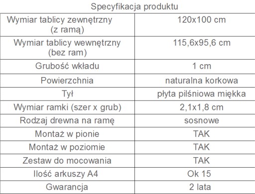 Tablica korkowa wykonana jest z wysokiej jakości korka portugalskiego, naklejonego na płytę pilśniową miękką, co daje grubość wkładu 10 mm. Pozwala to na wbijanie długich szpilek bez obaw, że przebije się tablicę na wylot.