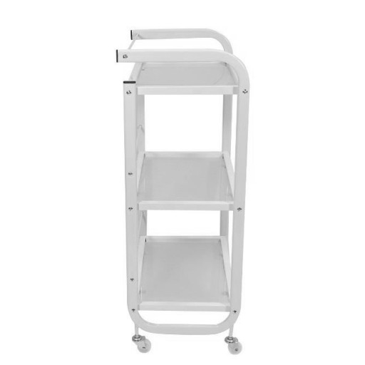 Stolik kosmetyczny z trzema półkami. Posiada stabilny stelaż z kółkami, które pozwalają na swobodne przemieszczanie stolika.