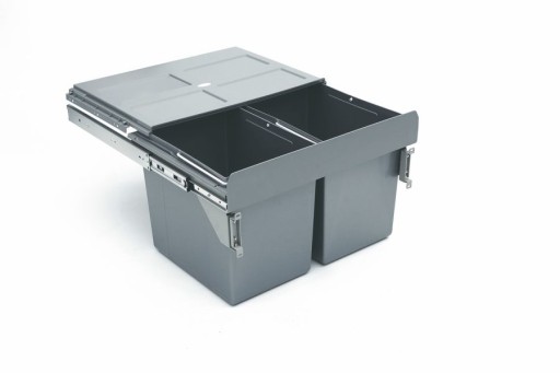Skład zestawu: 2x pojemnik na śmieci, plastikowe wieko, rama stalowa, prowadnice