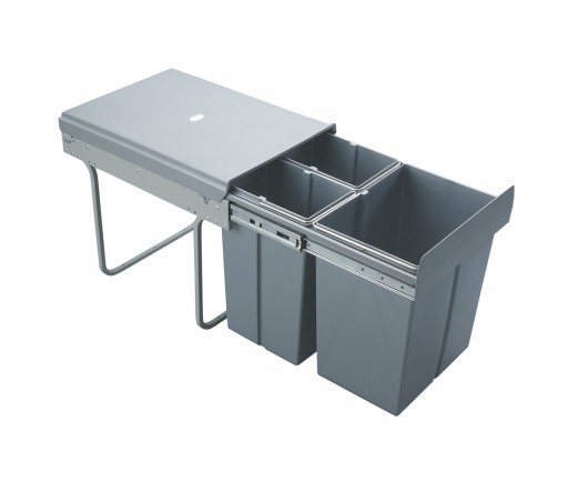 Skład zestawu: 3x pojemnik na śmieci, plastikowe wieko, rama stalowa z prowadnicami.