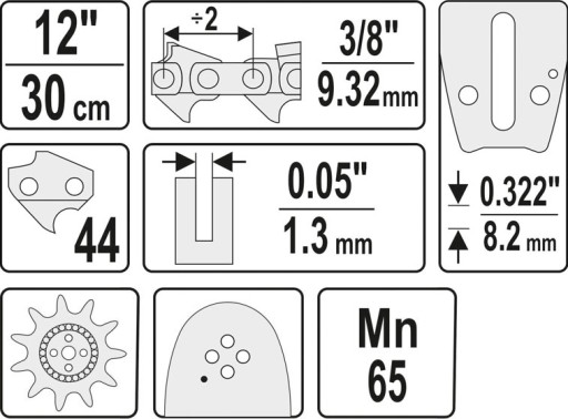 Długość 12", 44 ogniw, podziałka 3/8", szerokość 0,05" (1,3 mm).