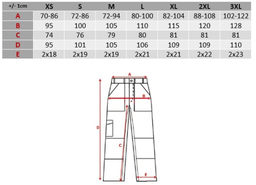 - Kieszenie: dwie poniżej pasa z przodu na zamek kostkowy, dwie kieszenie na nogawkach po zewnętrznych stronach ud (obie na zamek kostkowy, na lewej kieszeni miejsce na telefon, na prawej druga mniejsza na rzep), dwie kieszenie klasyczne z tyłu (bez klapek).