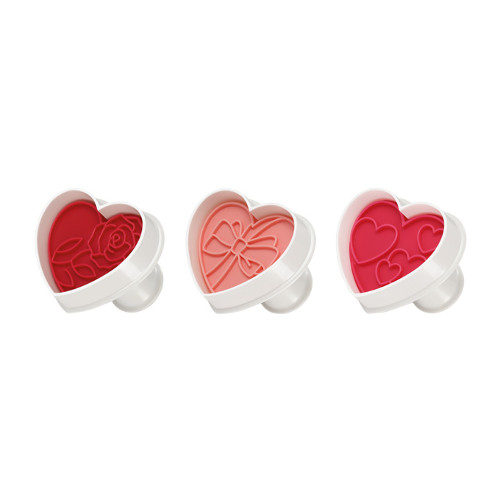 W zestawie znajdują się 3 foremki z tłoczkiem do ciastek w kształcie serduszek z trzema wzorami na pieczątkach: kokarda, róża i małe serduszka.