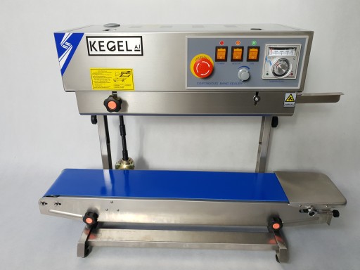 Stałocieplna zgrzewarka taśmowa do zgrzewania woreczków w pozycji pionowej.