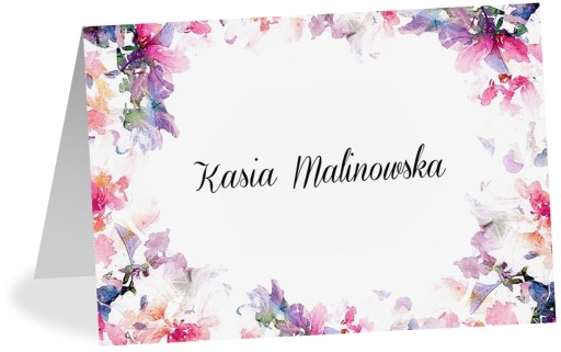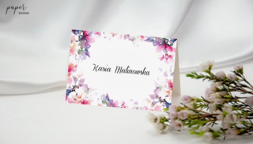 Winietki z kolekcji Rustyk Flower, z grafiką. Bigowane, gotowe do postawienia na stole.