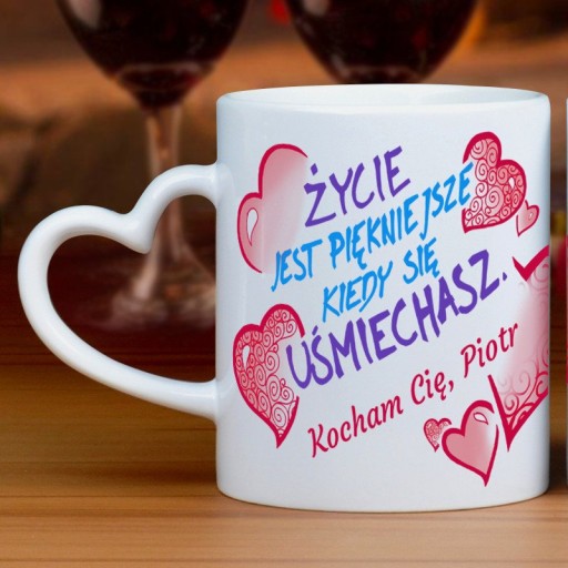Wysokiej jakości, personalizowany kubek z kolorowym nadrukiem.