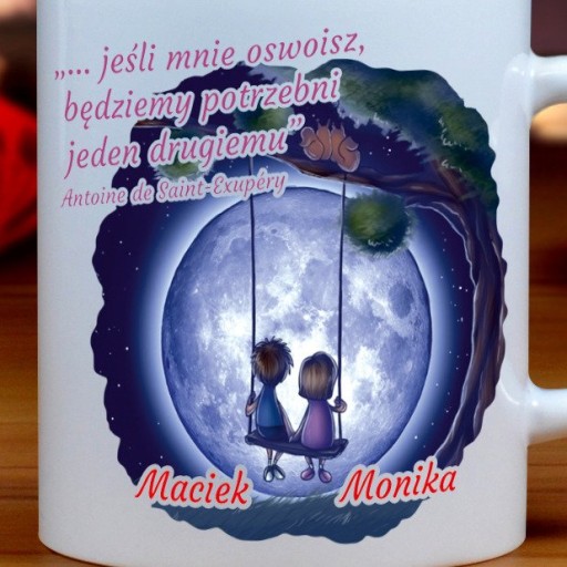 Na kubku wykonamy kolorowy nadruk jak na zdjęciu oraz dowolne imiona zakochanej pary, które należy podać w uwagach do zamówienia.