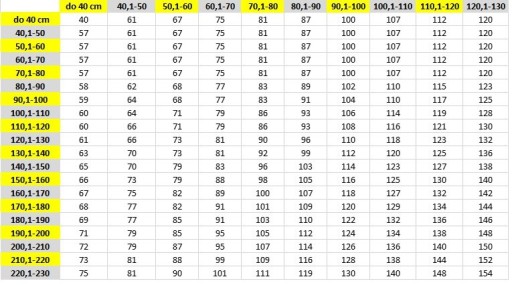 Poniższa tabela informuje ile należy kupić sztuk do wymaganego rozmiaru plisy.